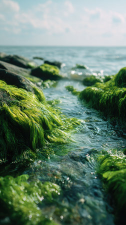 Discovering the beauty of green moss covering rugged rocks by the waters edge