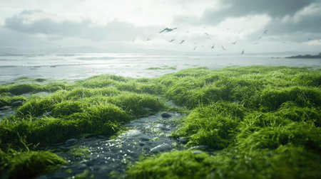 Green seaweed drifting in a coastal puddle, with the nearby beach stretching into the distance and seagulls flying overhead. --chaos