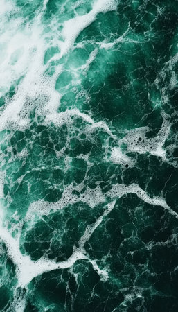 An intense overhead perspective of a stormy sea. Dark emerald green water churns, creating powerful white waves and foam, forming a dynamic and abstract natural texture.