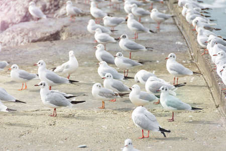 A flock of seagulls on the coast at Samut Prakan Province in Thailand.