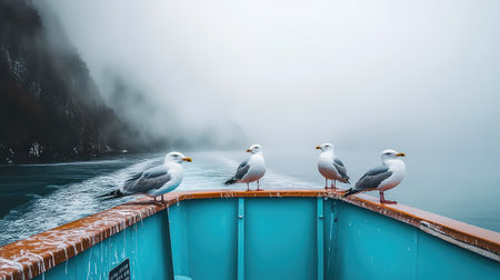 A serene scene featuring four seagulls perched on the edge of a turquoise boat amidst misty waters and dramatic cliffs. The soft lighting creates a tranquil atmosphere, perfect for nature lovers and adventurers.