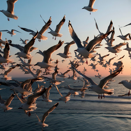 Flock of seagulls flying in the sky in sunset light