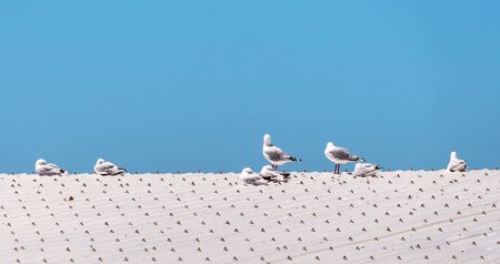 A flock of seagulls resting on an iron roof against a clear blue sky