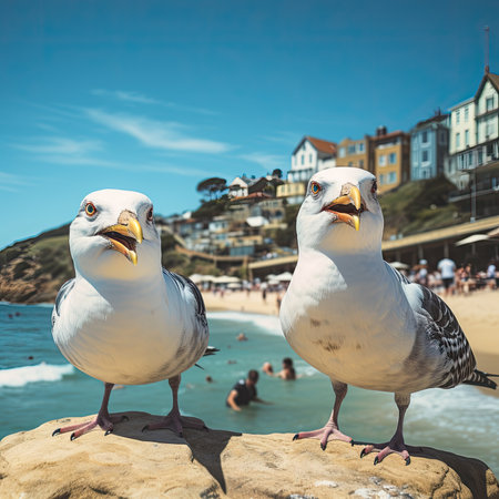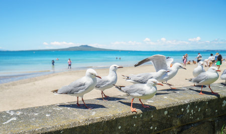 Seagulls enjoying the sunny day on the beach. Unrecognizable people playing on Takapuna beach in summer. Auckland.