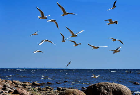 Flock of seagulls flies near the sea shore.