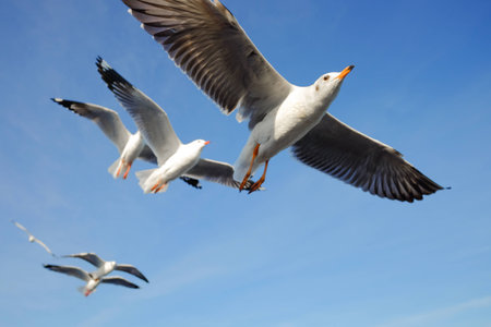 Seagulls flying in the vivid blue sky