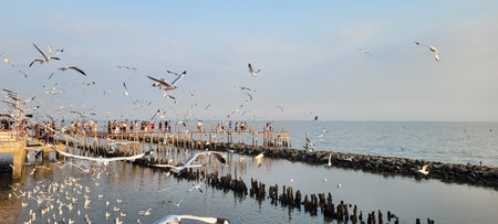 Samut Sakhon, Thailand - December 28th, 2025: A large flock of seagulls flying around tourists on the Red Bridge in Samut Sakhon, Thailand.