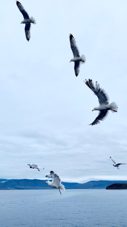 Seagull flying in the sky over Lake Baikal. Beautiful mountain landscape on a cloudy day.