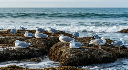 A flock of seagulls on a rocky co