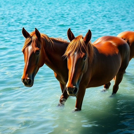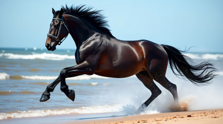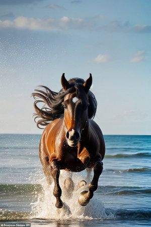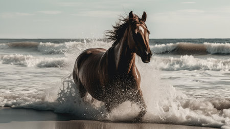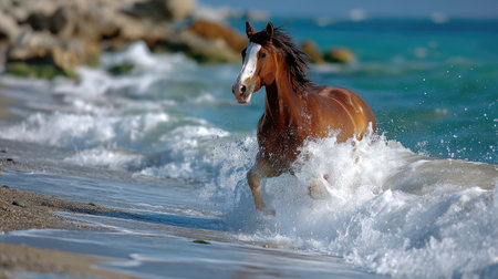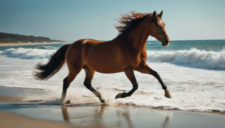 A stunning brown horse joyfully gallops through the surf, creating splashes against the backdrop of a picturesque beach and bright sky.
