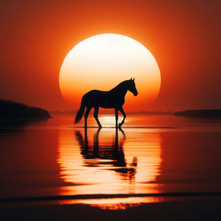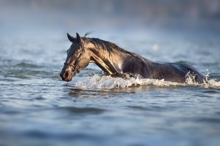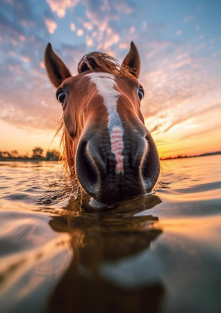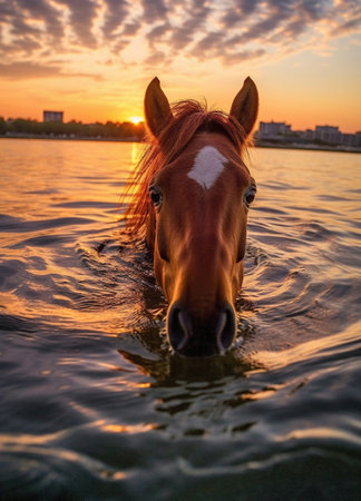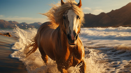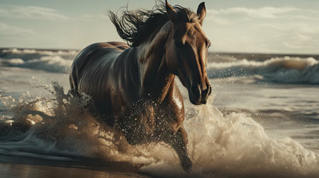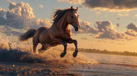 Majestic horse running through water at sunset, creating dramatic splash effect. Dynamic action shot captures power and grace of stallion against golden sky background.