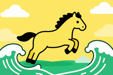 A stylized cartoon of a yellow horse with a black mane leaping over stylized green and white waves against a yellow sky with white clouds.