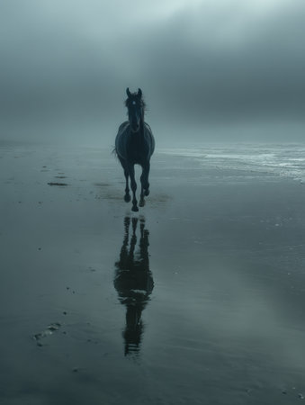A powerful black horse runs along a misty beach at dusk, its reflection shimmering in the wet sand, enveloped by an ethereal fog and soft waves.