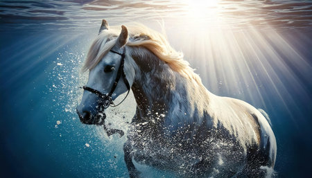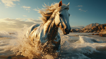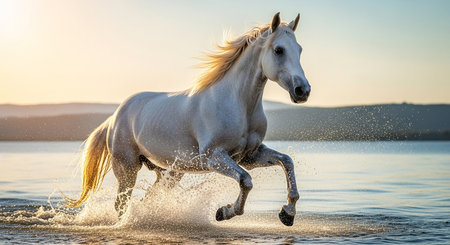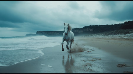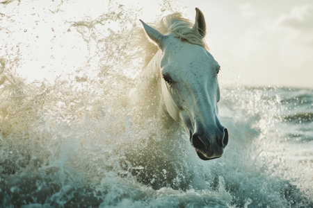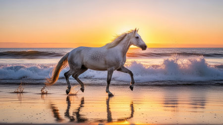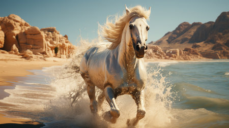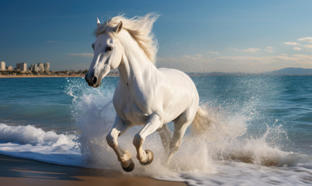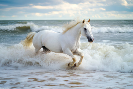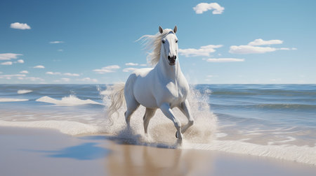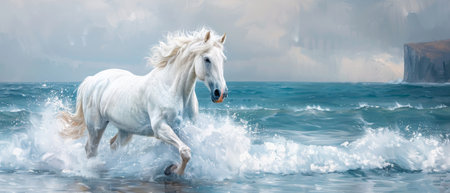 Dynamic white horse runs along shoreline splashing through waves, evoking freedom, grace, and natural power.