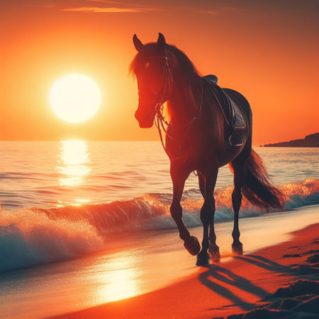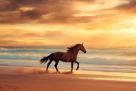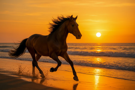 A majestic horse gallops on the sandy beach during a vibrant sunset