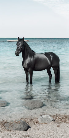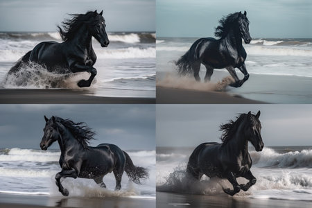 Black Horse in Wild, Running Stallion by Seaside, Beautiful Black Horse Collage, Abstract Generative AI Illustration