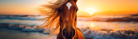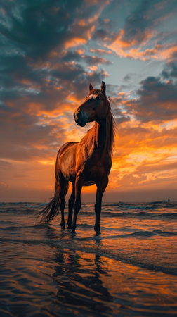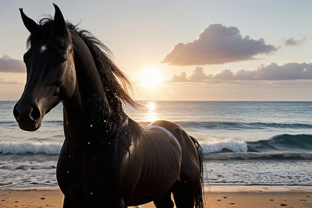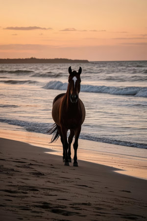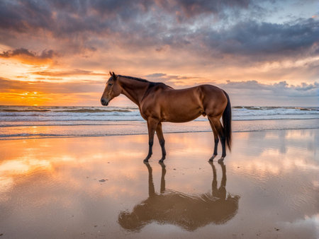 Horse standing on beach at sunset, serene landscape. Nature and wildlife concept