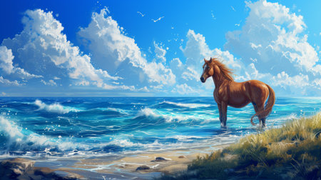 Chestnut Horse in Wild, Running Stallion by Seaside, Beautiful Brown Horse, Abstract Generative AI Illustration