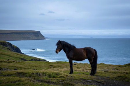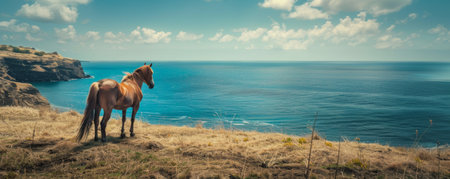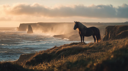 A horse stands proudly on a grassy cliff, gazing at the waves hitting the shore beneath rocky cliffs. The sky is painted with warm colors as the sun sets, creating a serene atmosphere.