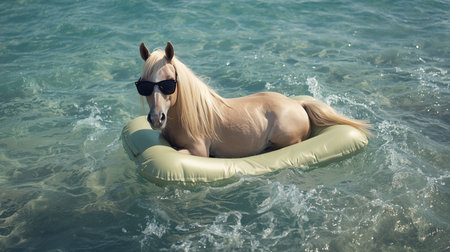 A horse sporting stylish sunglasses is lounging in a colorful pool float surrounded by tranquil water. It appears to enjoy a warm, sunny day by the beach