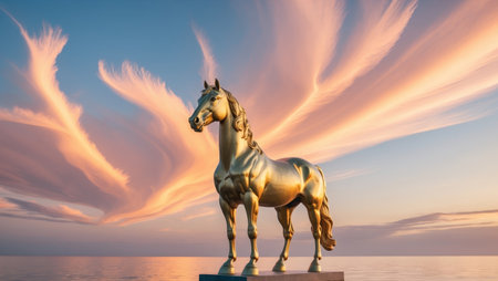 AI Generated. Majestic golden horse statue on water at sunset with dramatic clouds