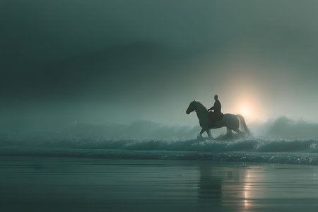 A lone rider silhouettes against the setting sun, cantering on a horse across a misty beach. the serene and mystical ambience of the scene blends the waves with the hazy horizon, creating a tranquil and dreamlike atmosphere. Generative AI