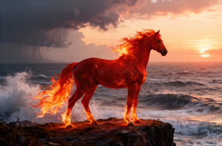 This stunning artwork depicts a powerful horse engulfed in flames, set against a dramatic seascape