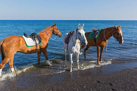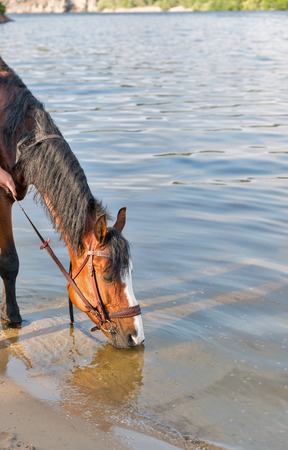 Horse on the beach at sunset in summer. Beautiful landscape with horse