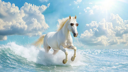 A stunning white horse with sunglasses joyfully runs through ocean waves, embodying freedom and adventure against a vibrant sky and sunny backdrop.