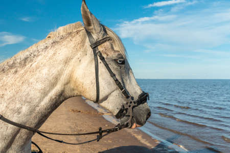 Graceful white horse galloping along the ocean shore, its mane flowing in the breeze. Panorama with copy space..