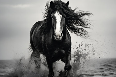 A black horse runs gracefully across the wet sand of a beach, splashing water as it moves, with a cloudy sky and ocean waves in the background.