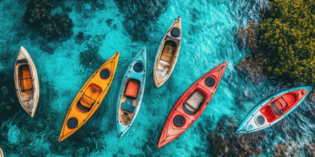 Colorful Kayaks Floating on Turquoise Water Summer Vacation Aerial View Sea Fun Top Blue Down Calm