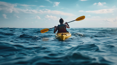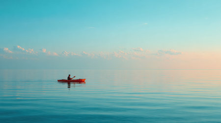 A man gracefully kayaks on the calm surface of the water. Generative AI