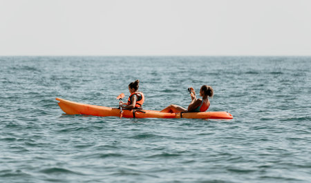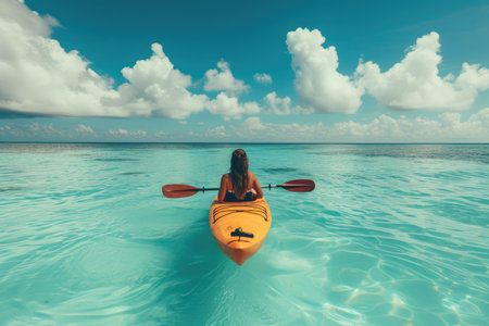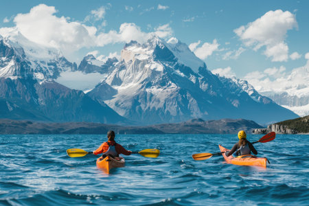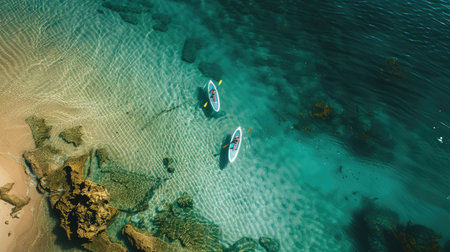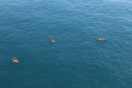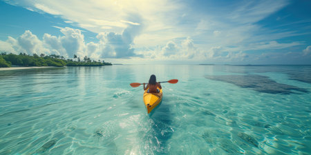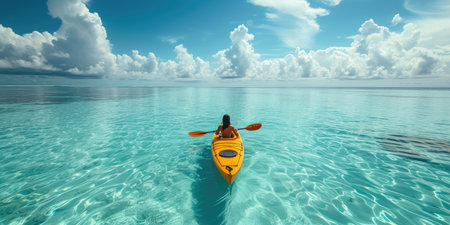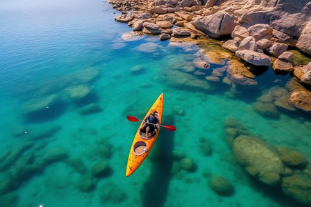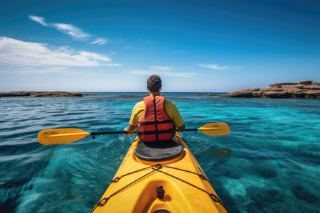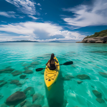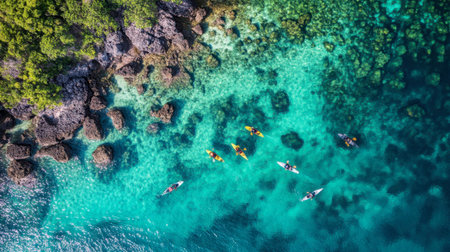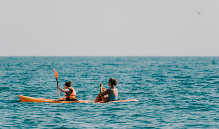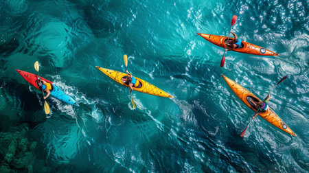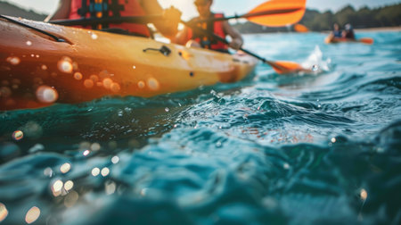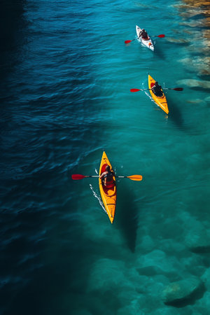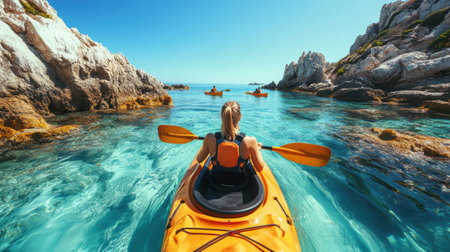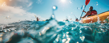 Dynamic image of people kayaking on clear, sunny day, gliding over sparkling blue waters. Thrill and freedom of perfect summer vacation adventure on the sea.