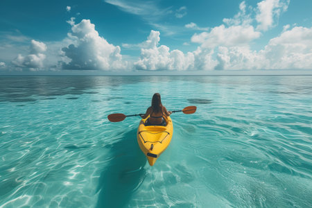 An AI generated illustration of Man kayaking on a serene body of water in a vibrant yellow kayak