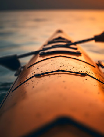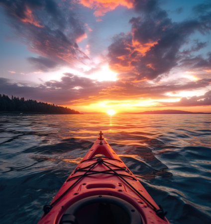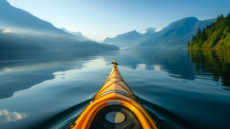 Kayak on a tranquil lake with mountains in the background at sunrise. Concept of outdoor adventure, nature exploration, water sports, serene landscape.