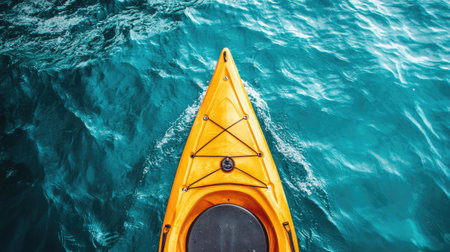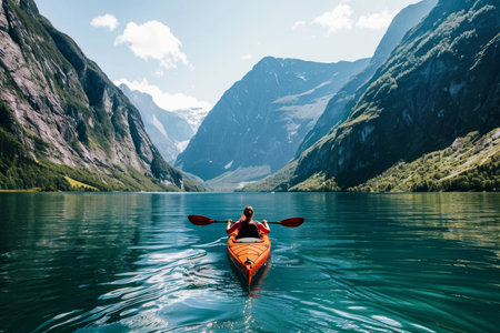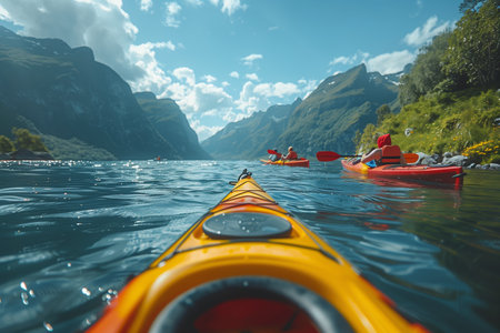 Sleek kayak on a calm lake surrounded by mountains. Concept of outdoor adventure, kayaking, nature exploration, serene waters.