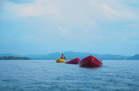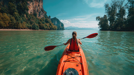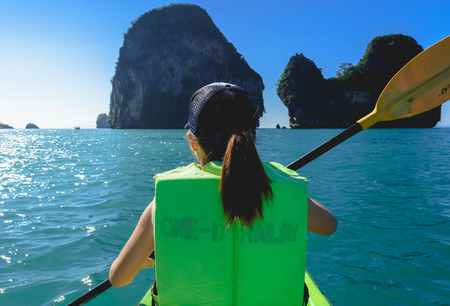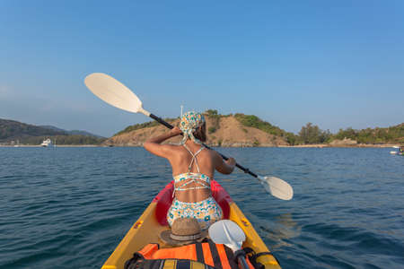 Woman kayaking in the sea on a sunny day. Beautiful landscape of Thailand