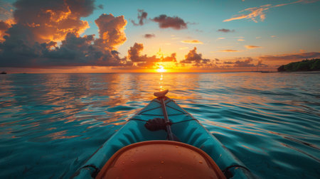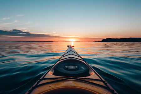 A kayak gliding on calm waters with the sun setting in the background, A serene scene of a kayak gliding across calm waters at sunset