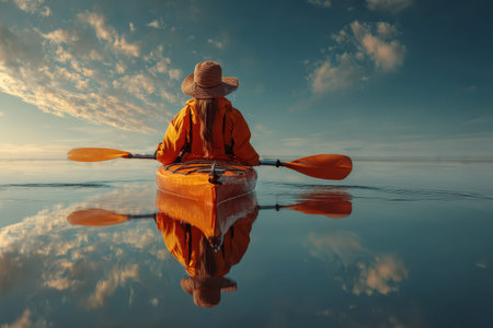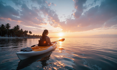 Woman kayaking on calm waters under a beautiful sky at sunset in a tranquil outdoor setting, enjoying nature's beauty and serenity