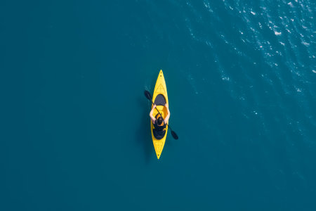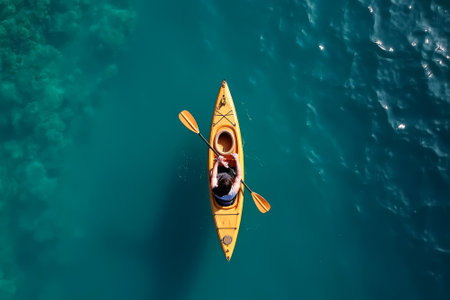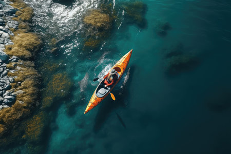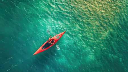 Aerial view of a man in a kayak paddling in the sea, Person rowing on a calm lake in autumn, aerial view only small boat visible with serene water around, AI generated