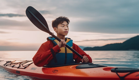 Kayaking is his lifestyle Young man kayaking on river with sunset in the background : Generative AI