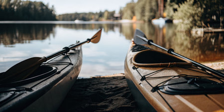 Two kayaks resting on the calm lake shore, ready for an outdoor adventure.