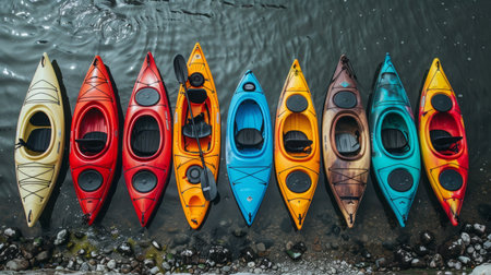 A stunning aerial view of vibrant kayaks arranged neatly on a dock above clear water, ideal for anyone seeking adventure and outdoor activities during the summer season.