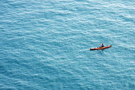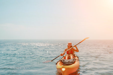 Kayak paddle sea vacation. Person paddles with orange paddle oar on kayak in sea. Leisure active lifestyle recreation activity rest tourism travel