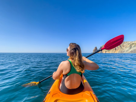Woman kayaking near a stunning coastal cliff, enjoying the tranquility of the ocean and exploring nature