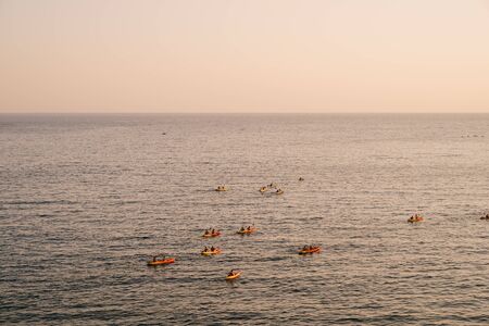 A group of tourists travel in pairs kayaks by sea against the sunset sky, near old town of Dubrovnik, Croatia. Concept banner travel. Aerial top view.