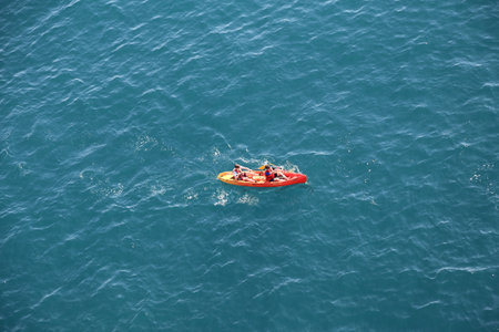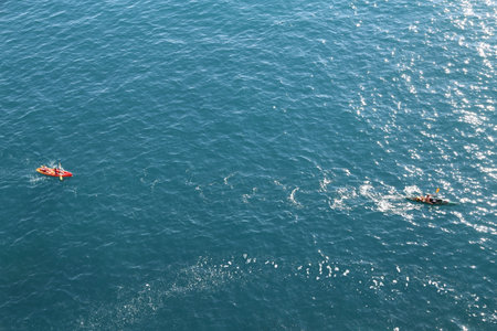 blue sea water, red yellow boat with oars floats, two people sport background Dubrovnik, Croatia April 22, 2023. High quality photo