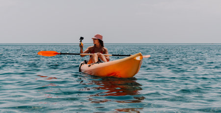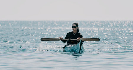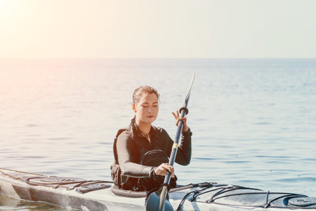 Woman sea kayak. Happy smiling woman in kayak on ocean, paddling with wooden oar. Calm sea water and horizon in background. Active lifestyle at sea. Summer vacation.