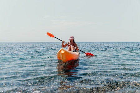 Kayak sea woman. Happy attractive woman with long hair in red swimsuit, swimming on kayak. Summer holiday vacation and travel concept.